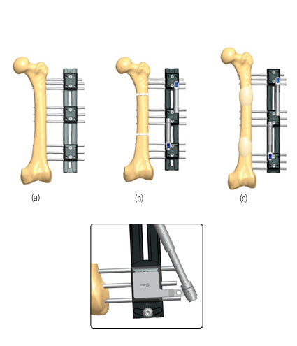 (b) Lengthening at osteotomy site with middle clamp locked to the rail.